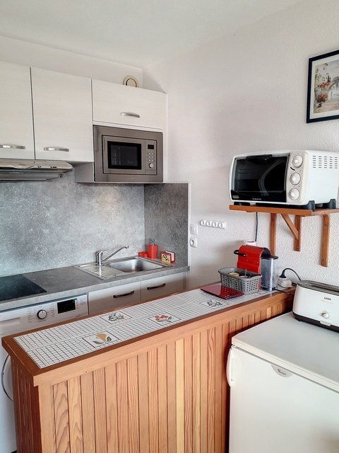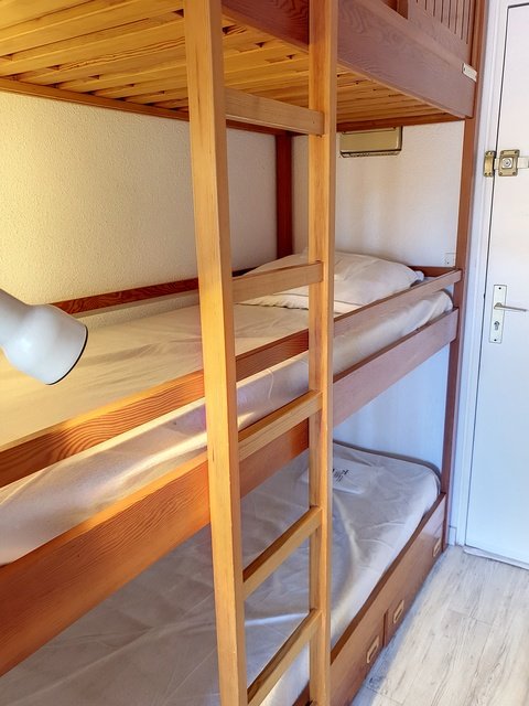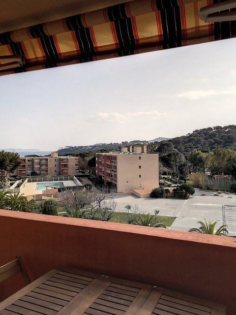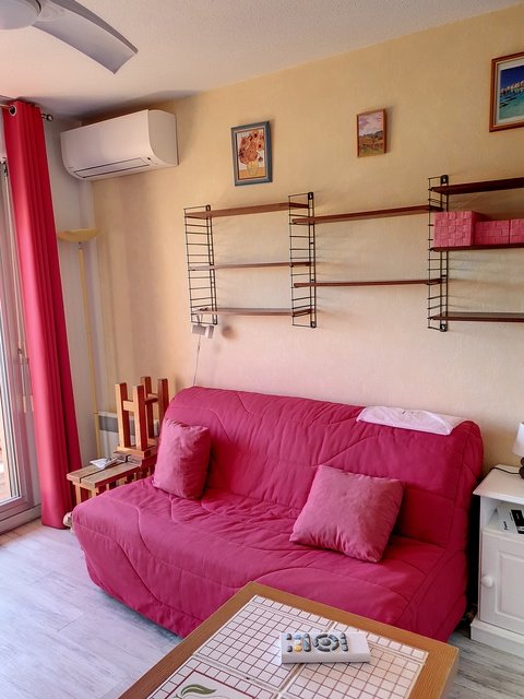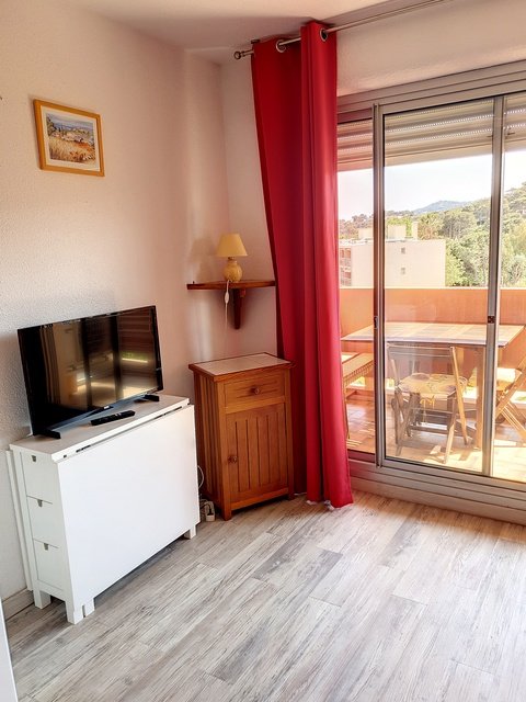Studio cabine de 20m², climatisé, situé dans le bâtiment F au dernier étage avec ascenseur, ce qui lui confère une vue dégagée et dominante sur les jardins, la piscine et la mer.Il est équipé pour recevoir 4 personnes, dont deux enfants (2 lits superposés dans l'entrée) et un BZ (140). Un coin cuisine modernisé et équipé (Micro ondes, mini four, lave linge), une salle de bain refaite à neuf avec baignoire et wc, un espace repas. Un garage est disponible en sous sol n°142. Animaux non admis. Ménage inclus dans le tarif. Accès à la piscine et aux tennis. Piscine ouverte de mi-Juin à Mi Septembre.Linge non inclus.