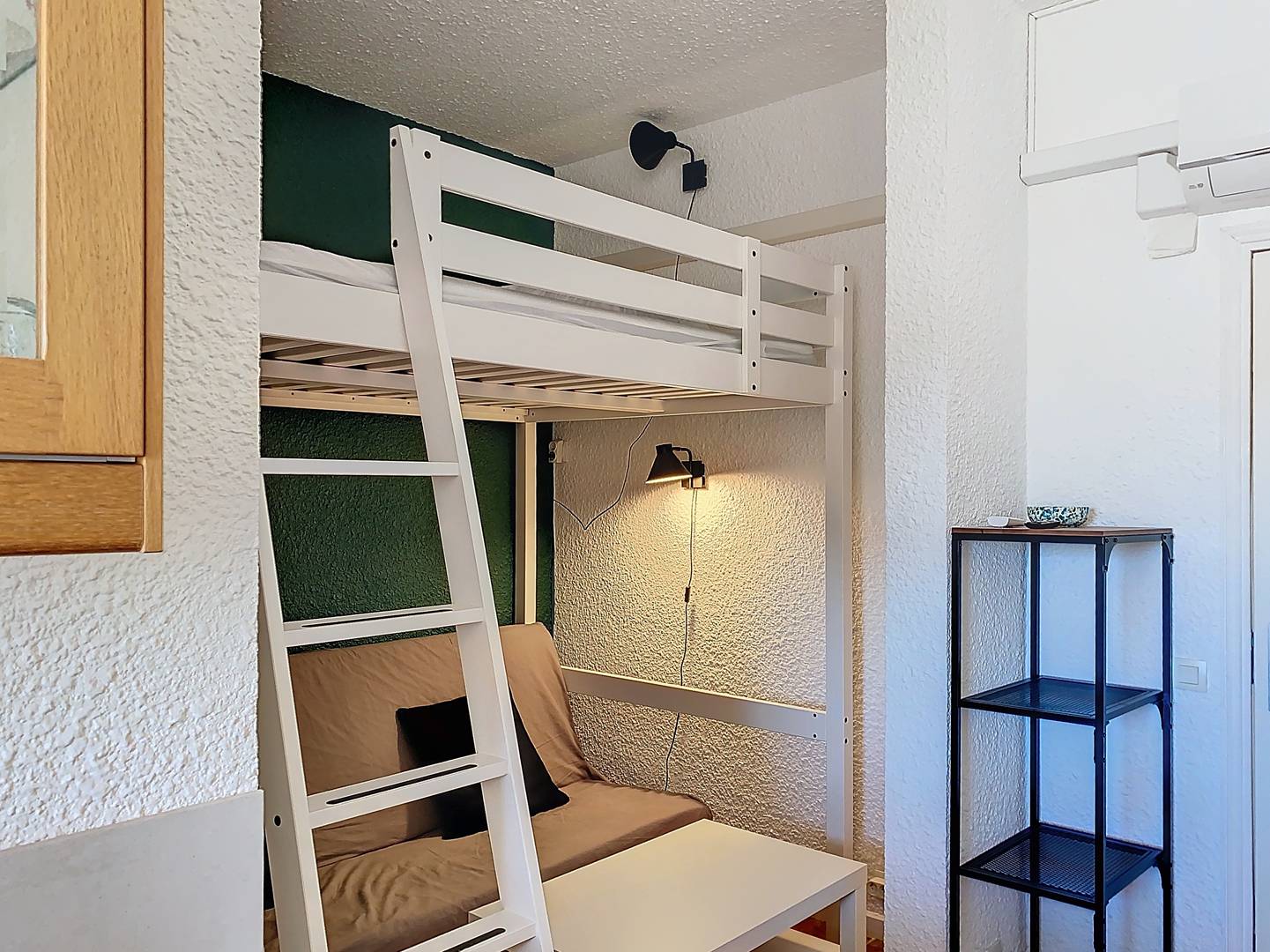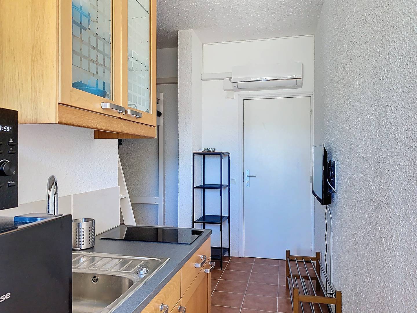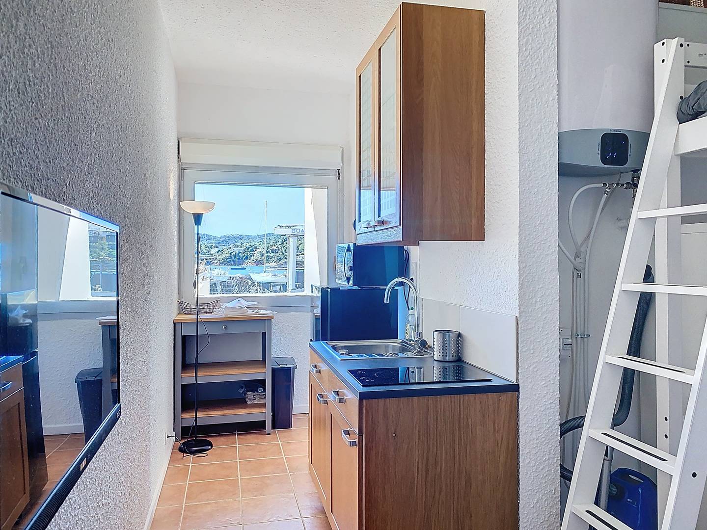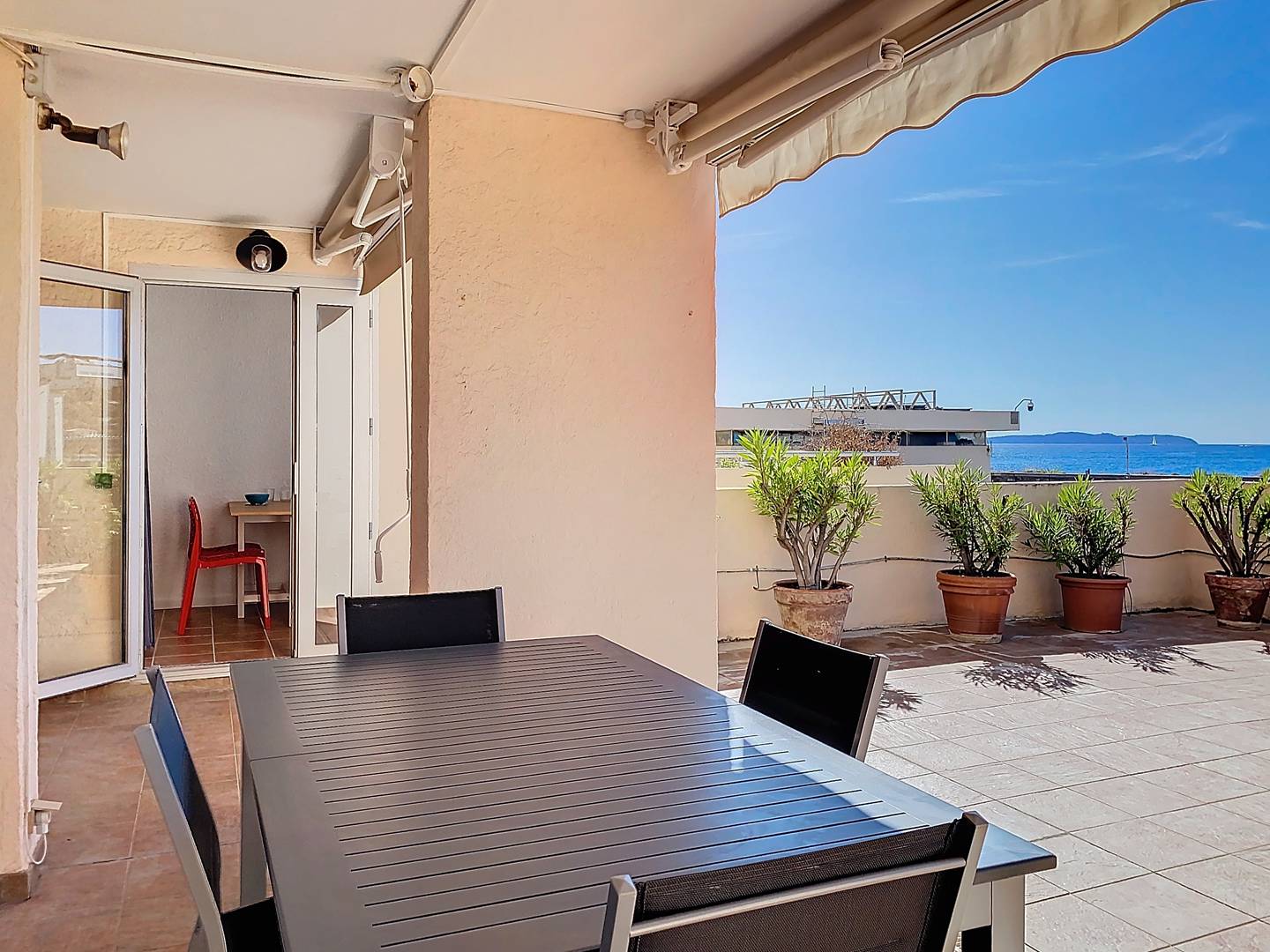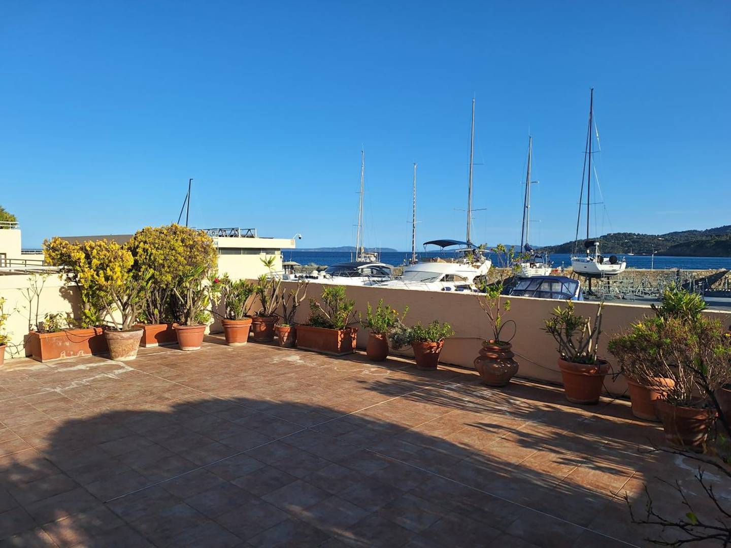 Studio de 21m², refait à neuf, climatisé, au 1er étage, bénéficiant d'une grande terrasse de 100m² aménagée, orientée Sud. Jolie vue mer sur le cap Bénat, l'île du Levant et sur le carénage.