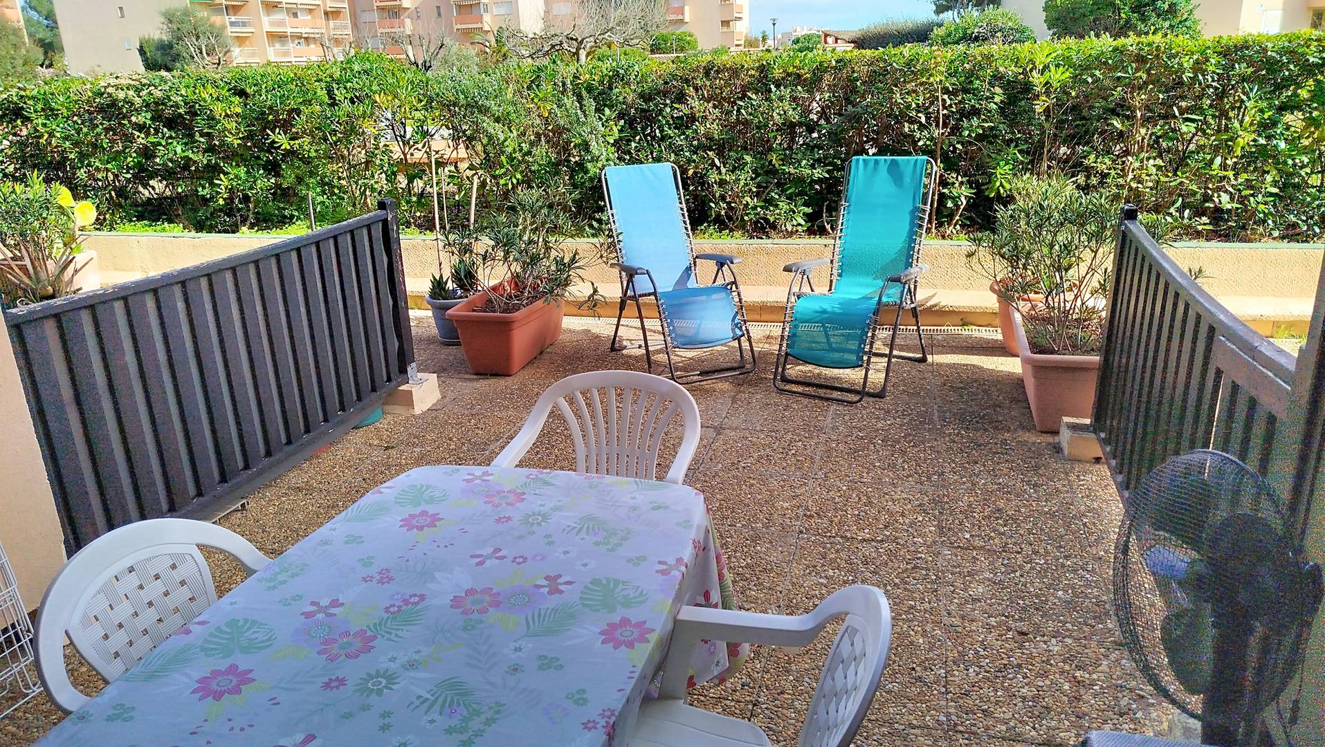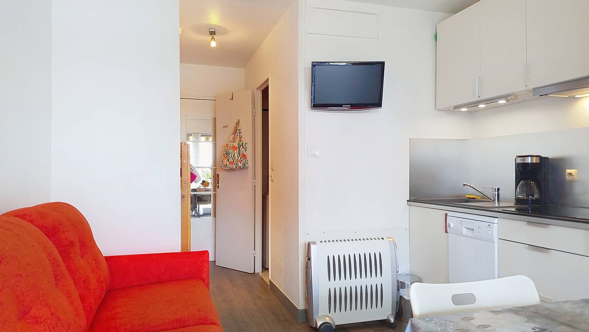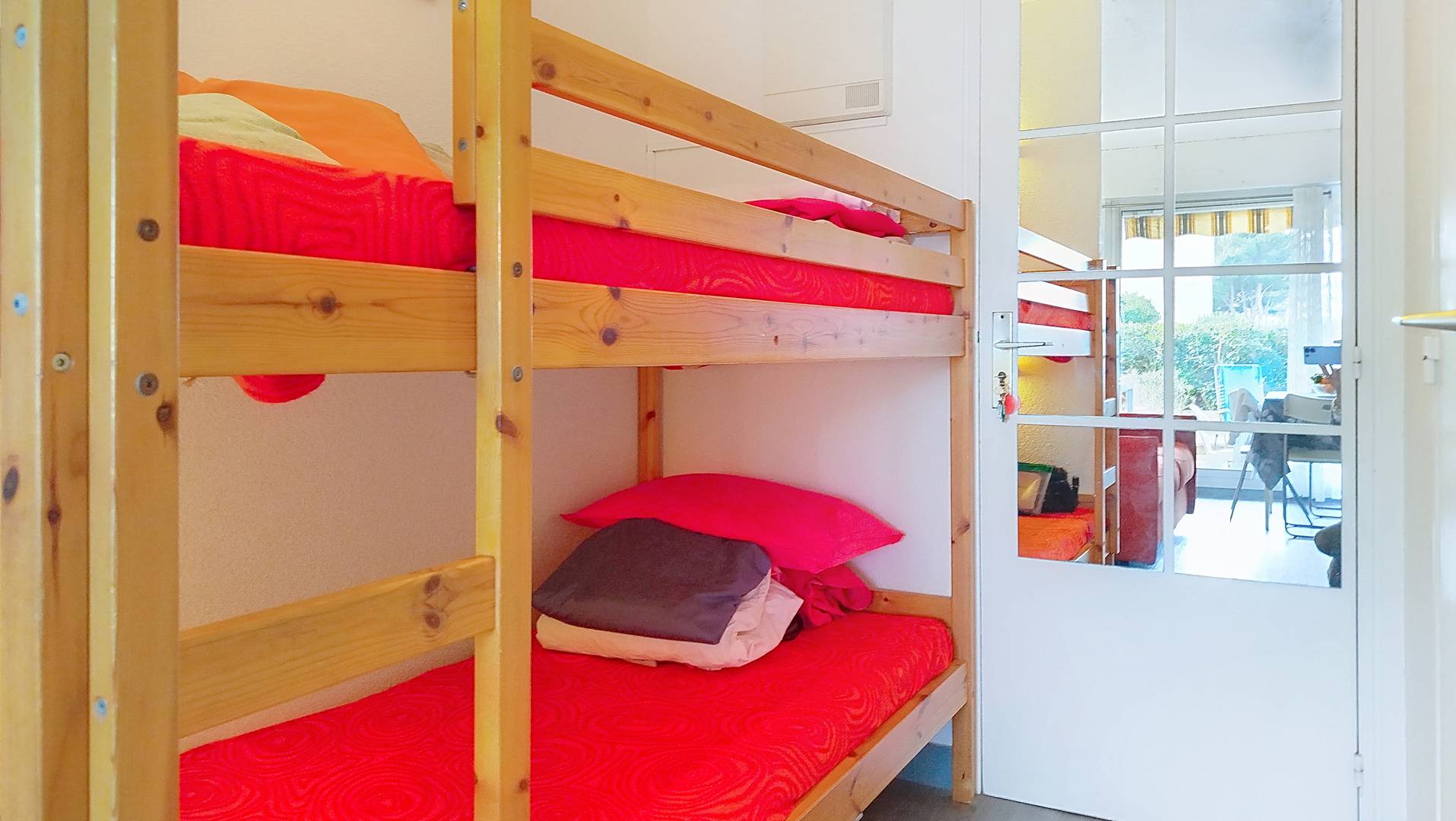 Studio de 18m² pouvant accueillir 4 personnes dont 2 enfants, équipé de 2 lits superposés à l'entrée, un convertible dans la pièce principale; celle ci dispose d'une TV, un espace repas et donne sur une terrasse extérieure de 15m² aménagée et exposée Sud, une salle d'eau/WC avec douche et lave linge, un emplacement parking numéroté 445. Animaux non admis. Linge en supplément à commander au plus tard une semaine avant arrivée. Ménage de fin de séjour inclus (sauf à la nuitée).Piscine ouverte de mi-Juin à Mi Septembre.
