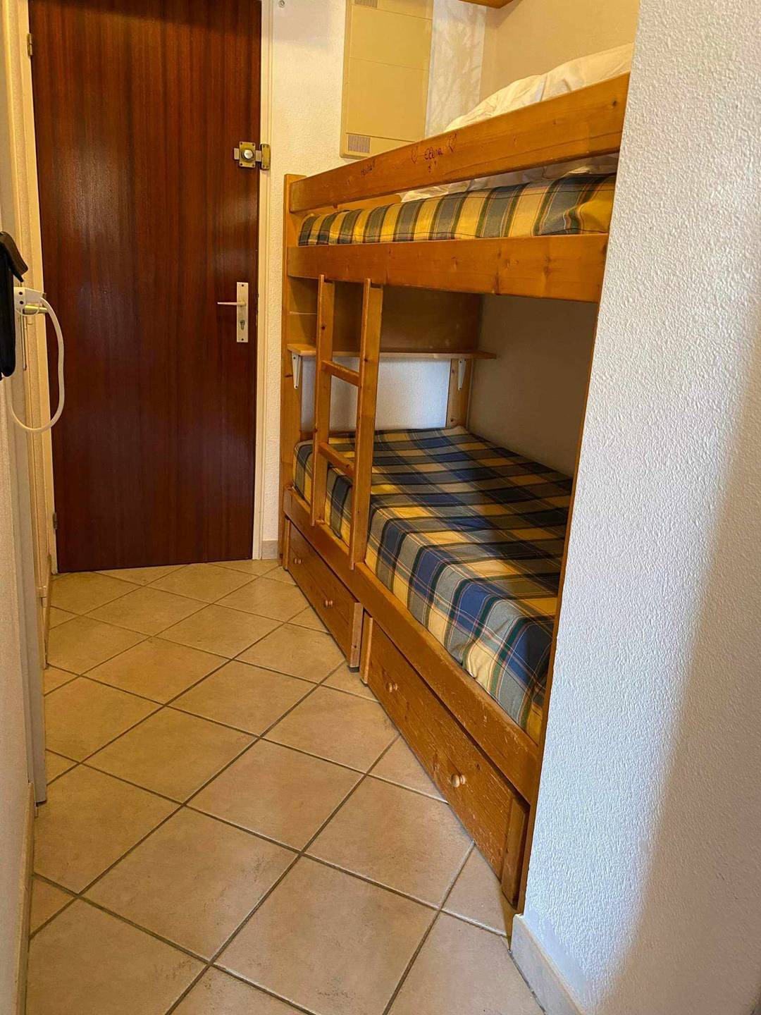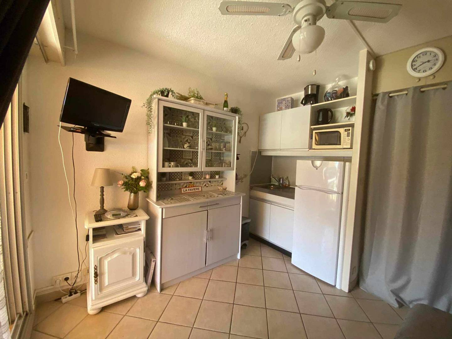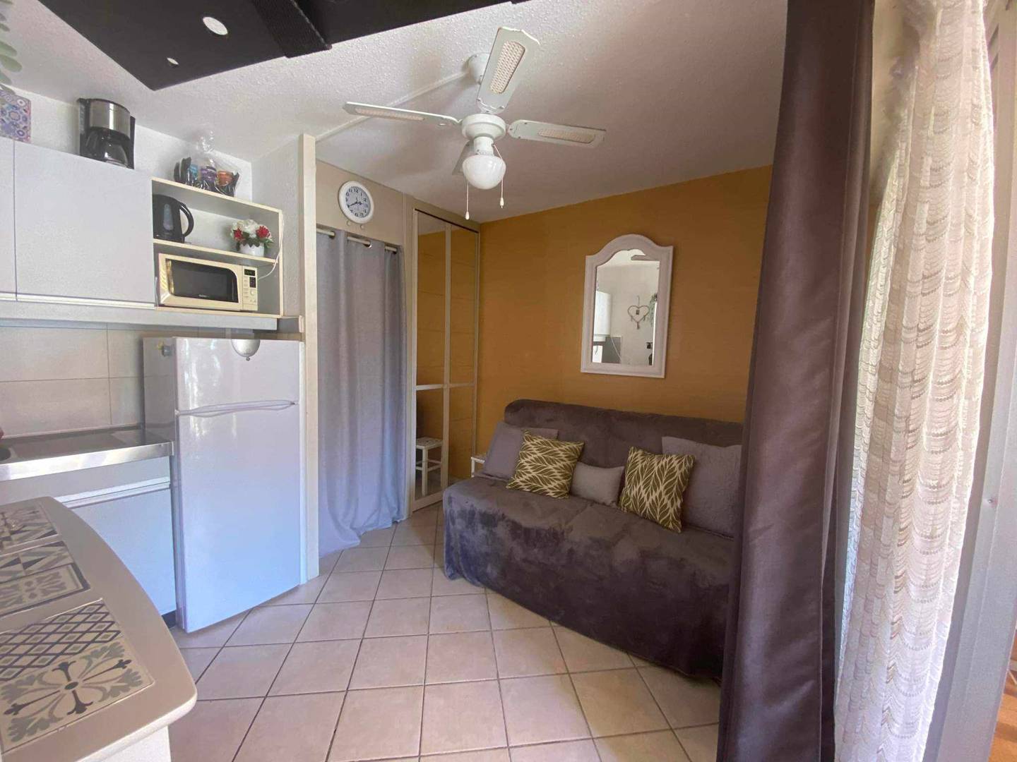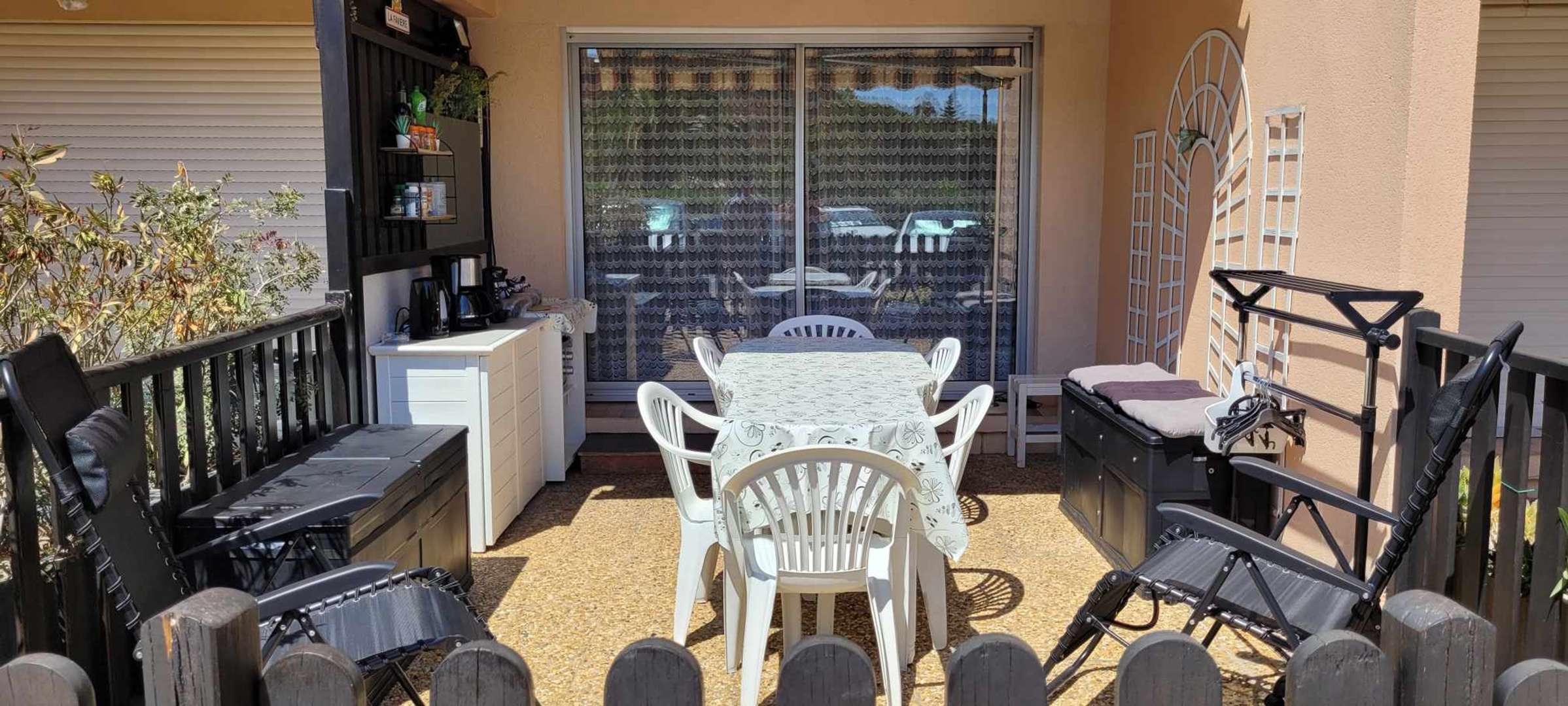 Studio de 18m²en RDJ équipé pour recevoir 4 personnes, composé de deux lits superposés (80), une salle d'eau/wc avec douche et Lave linge, une pièce à vivre avec un espace couchage (convertible 160) un coin cuisine (évier, micro-ondes), un vaisselier, un TV murale, donnant sur une terrasse exposée Sud, aménagée et fonctionnelle (table, chaises, fauteuils, plaque de cuisson, four) permettant de cuisiner en extérieur. Parking numéroté 209. Accès à la piscine collective. Animaux non admis.