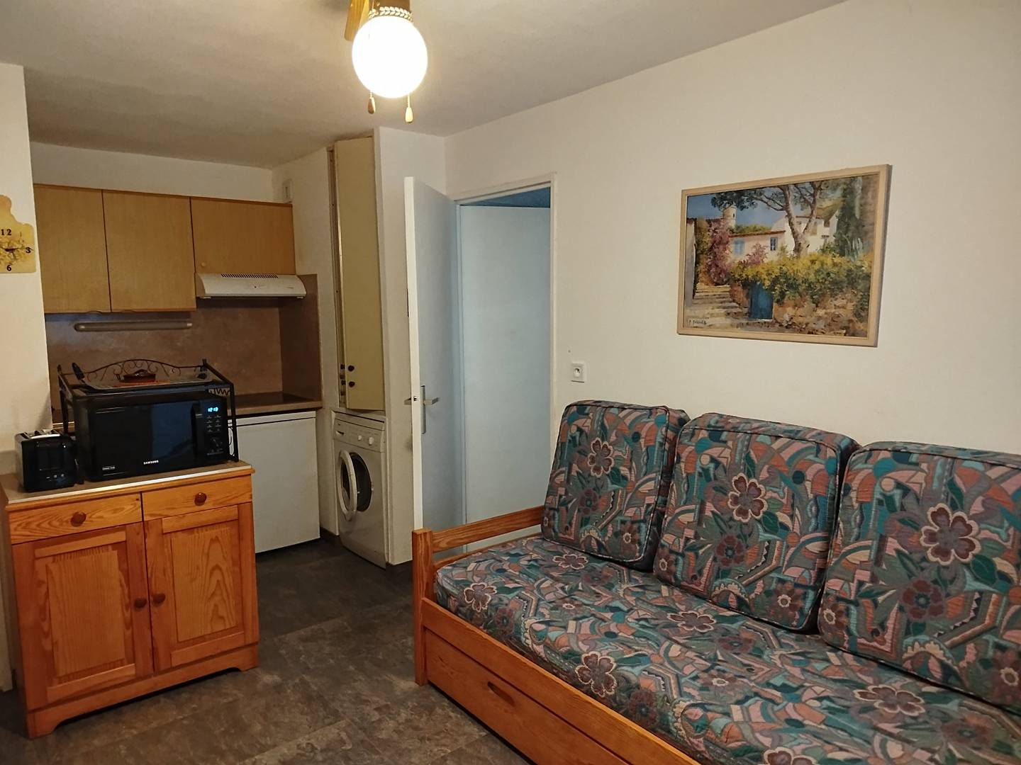 T2 de 30m² dans résidence sécurisée Côte Azur 5, pouvant accueillir 4 personnes, composé d'une chambre (lit 140) une salle d'eau rénovée avec WC, une pièce à vivre (canapé gigogne, Tv murale, table et chaises) avec un espace cuisine (Lave vaisselle Lave linge Micro ondes frigidaire /congélo), une loggia fermée et aménagée, un garage en sous sol N°178. Animaux non admis. Linge en sus. Ménage inclus dans le tarif. Commerces à proximité, plages et restaurants.